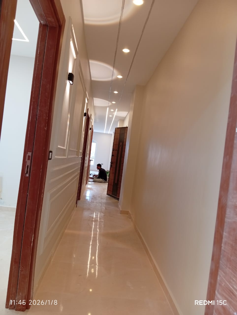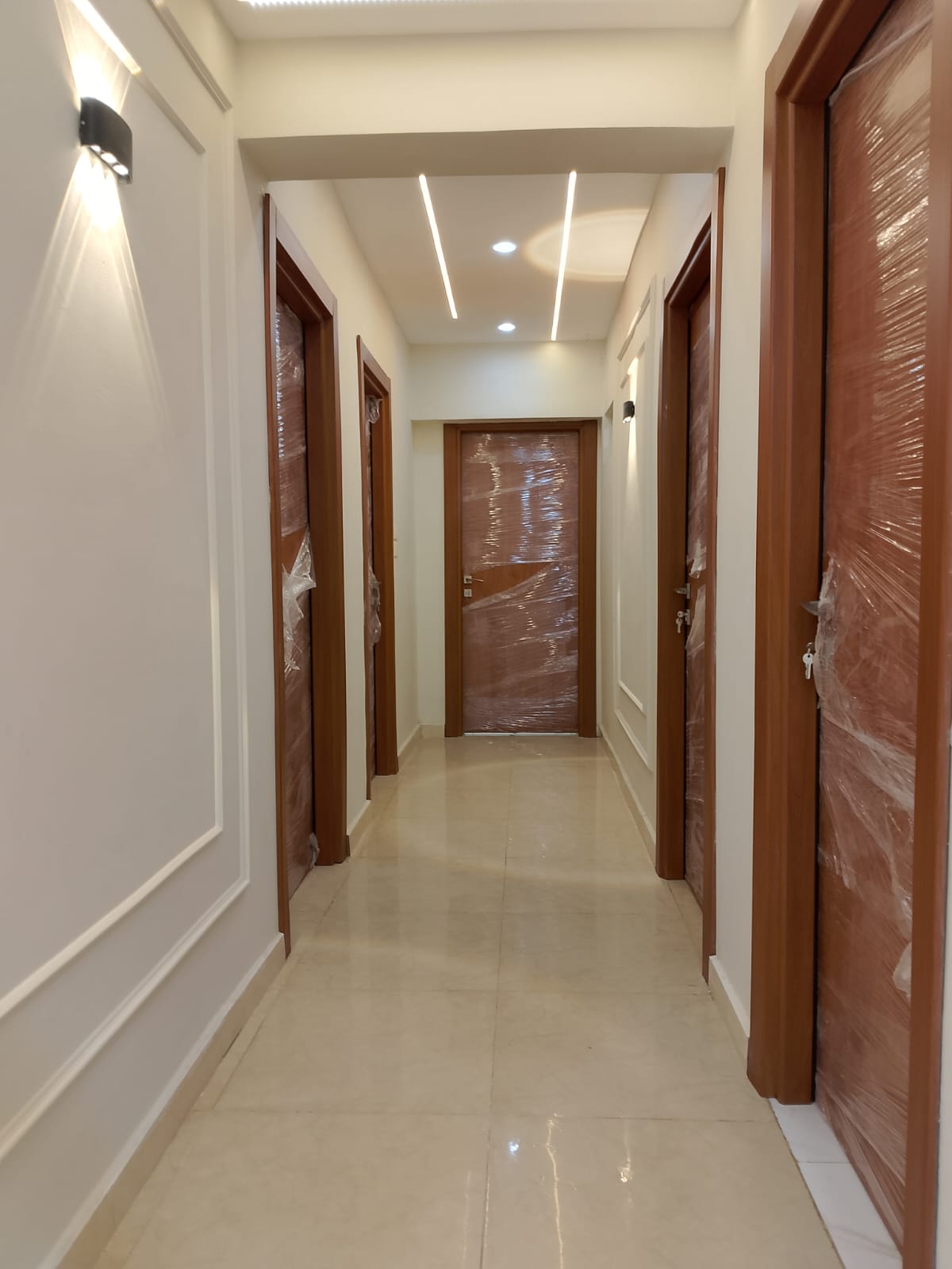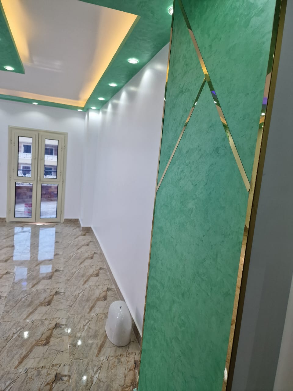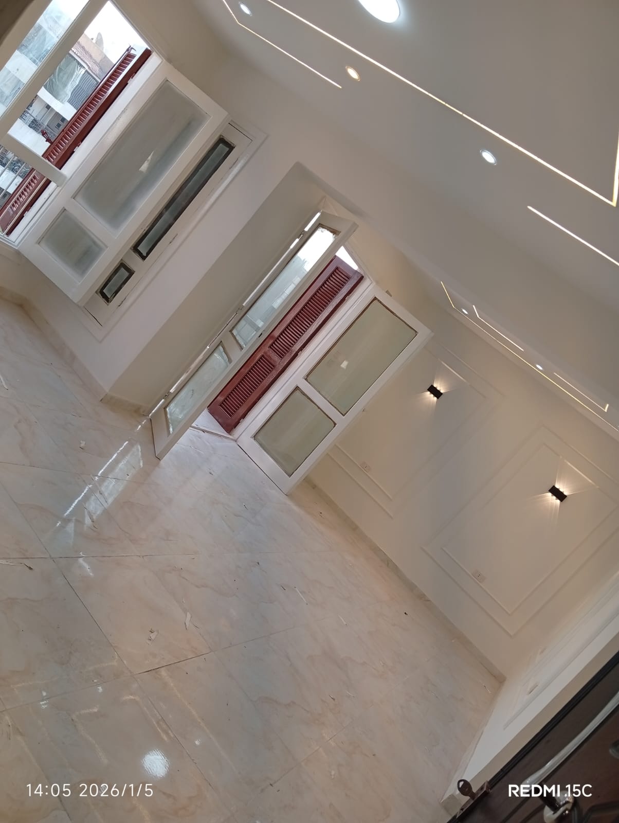4. التشطيبات النهائية: تركيب الأرضيات (بورسلين، رخام، HDF)، والدهانات بأحدث التقنيات والألوان الكمبيوتر، وتركيب الأبواب والشبابيك (Alumetal/UPVC).