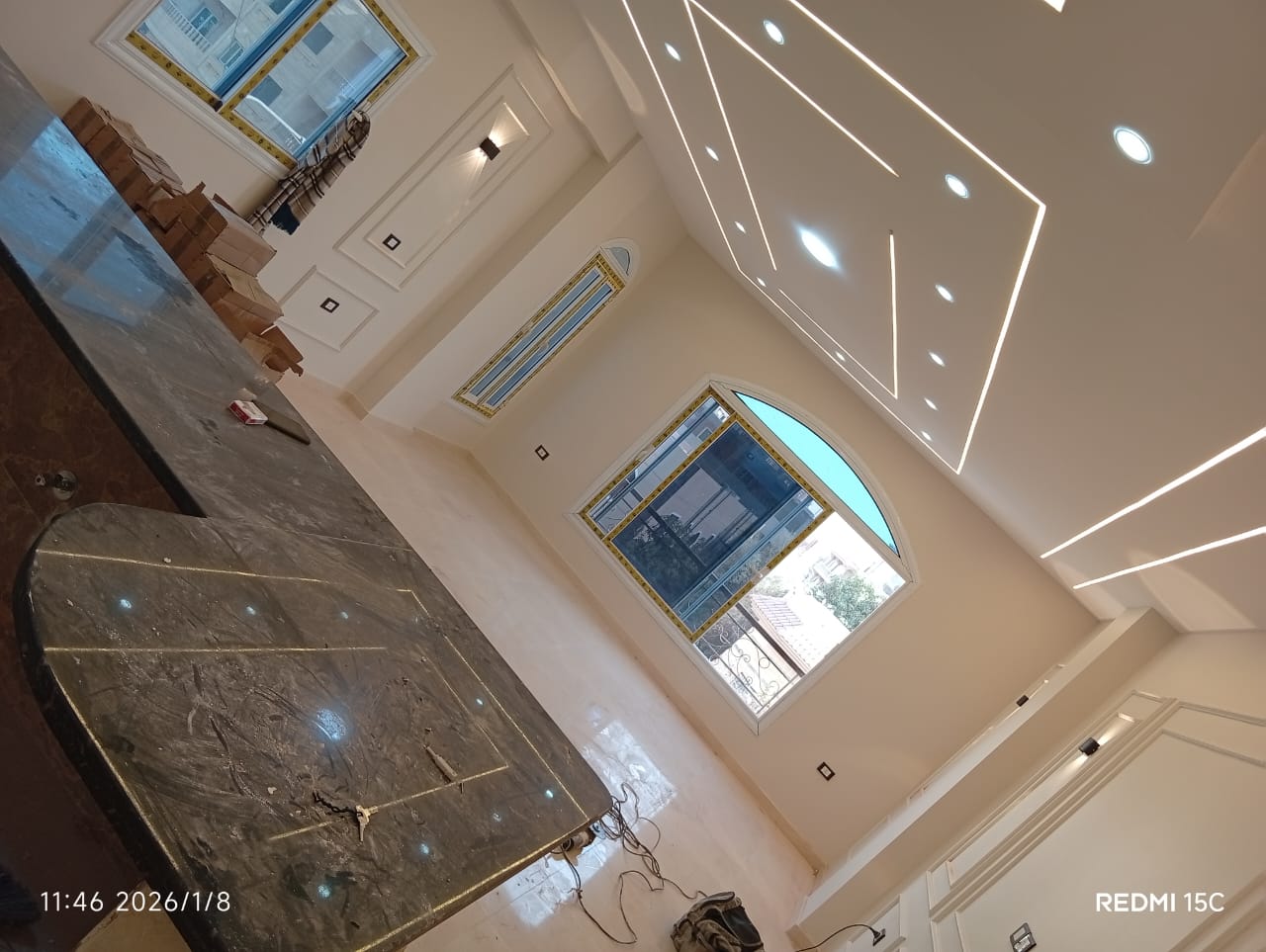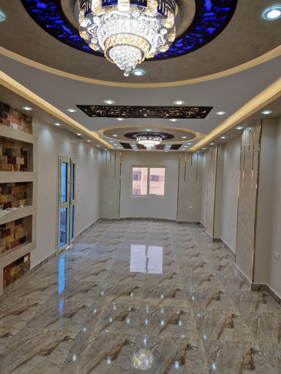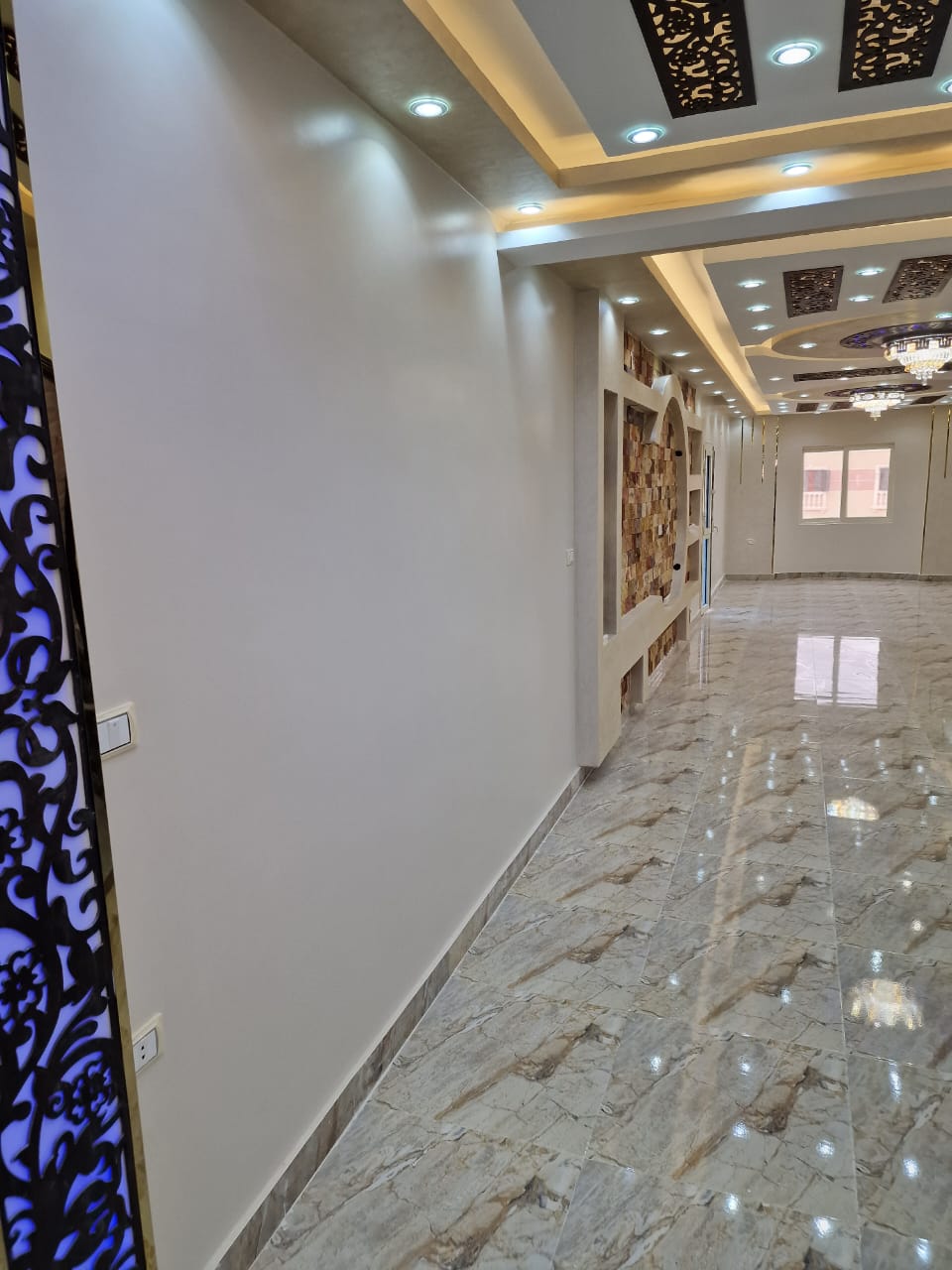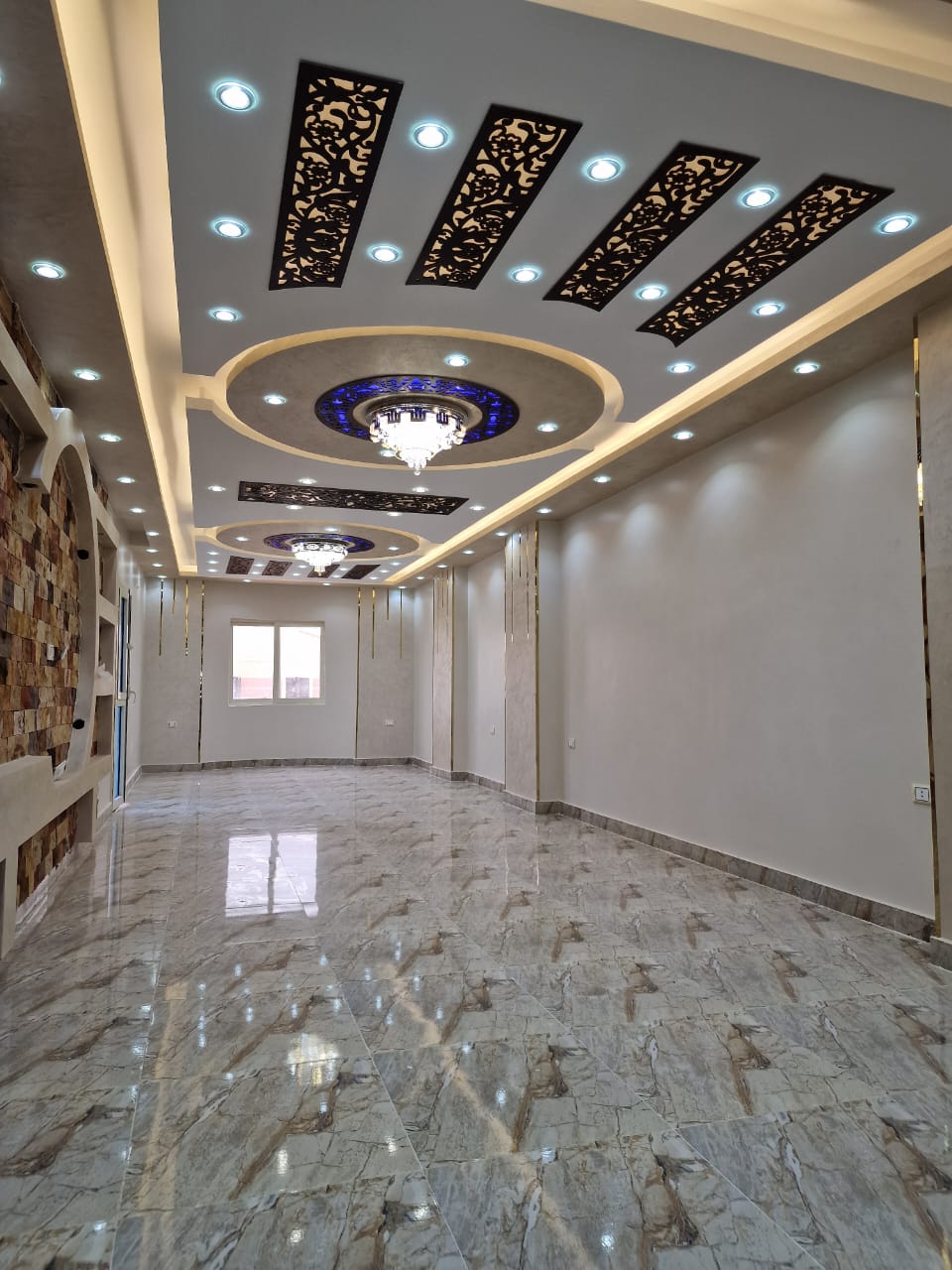 3. الديكور واللمسات الجمالية: تنفيذ أعمال الجبس بورد، الأسقف المعلقة، وتوزيع الإضاءة بشكل مدروس يبرز جمال الأثاث والمساحات.