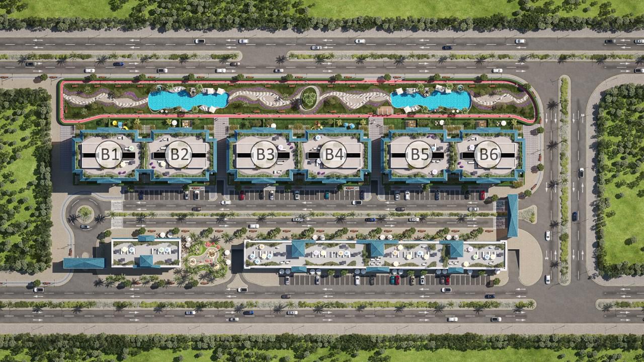 التصميم المعماري: يتكون المشروع من 6 عمارات فقط (أرضي + 5 أدوار متكررة).