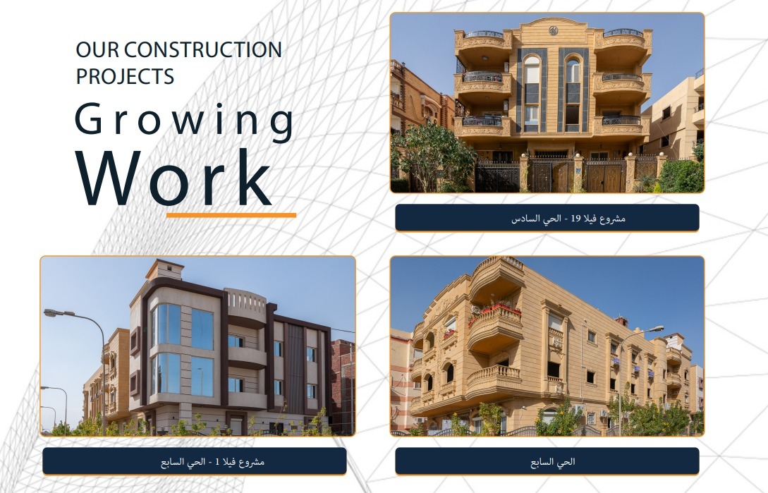 سابقة الأعمال والإنجازات: نفخر بسجل حافل بالإنجازات على مستوى مدينة العبور، حيث قمنا بتسليم مشاريع سكنية متكاملة (عمارات وفيلات) في الأحياء الحيوية بالمدينة.